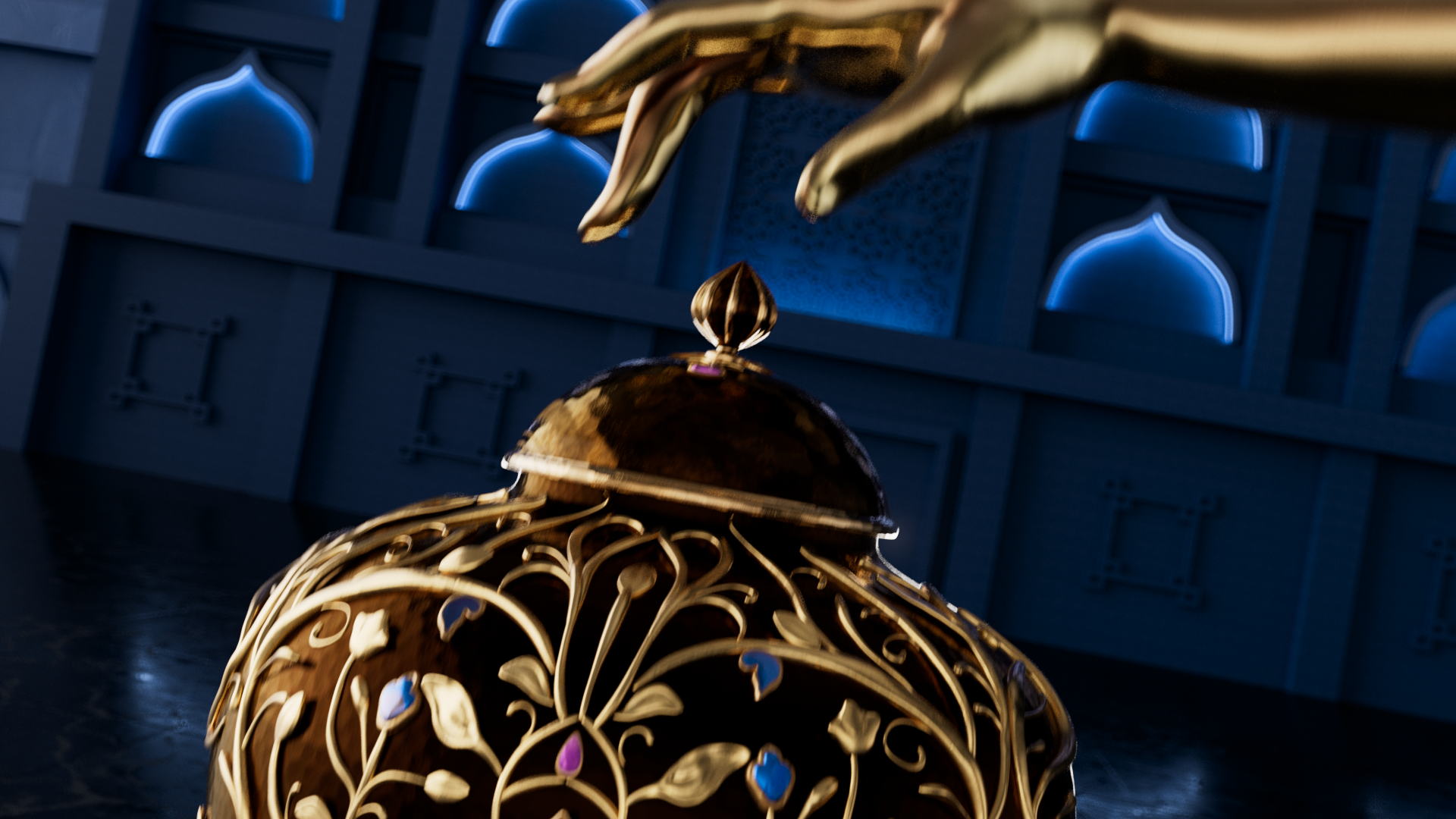 For my new demo reel intro, I explored themes rooted in my time as a Fulbright Scholar in Nepal. The central hand is directly inspired by my study of traditional Buddhist statuary, translating the specific proportions used by master sculptors into a digital medium. My background as a metalsmith informed the design of the vessel, which I sculpted in ZBrush to reflect the tactile quality of metalwork. Finally, particle simulations fluidly form my name, bridging ancient sculptural influences with modern motion design.